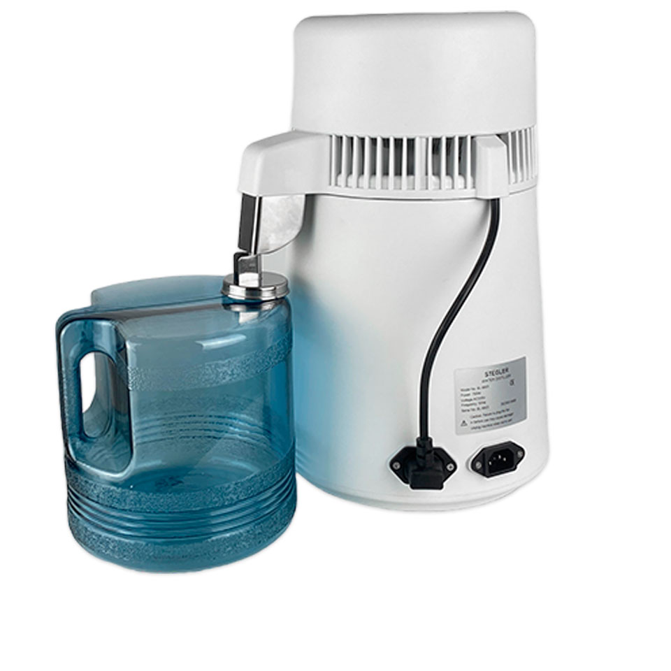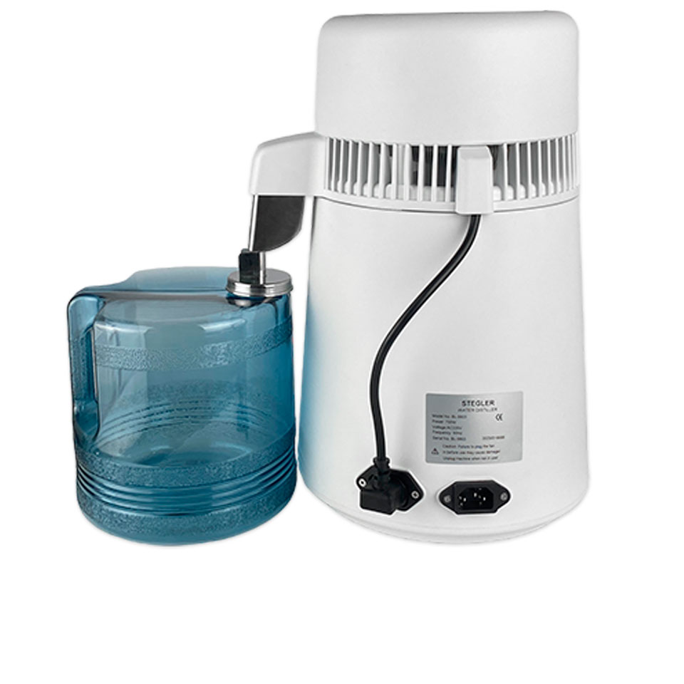 Аквадистиллятор STEGLER BL 9803 — это небольшой настольный дистиллятор в корпусе из пластика и с пластиковой колбой водоприёмника. Он предназначен для использования там, где не нужен большой объём воды — для маленьких лабораторий, аптек, ветеринарных клиник или для домашнего использования.