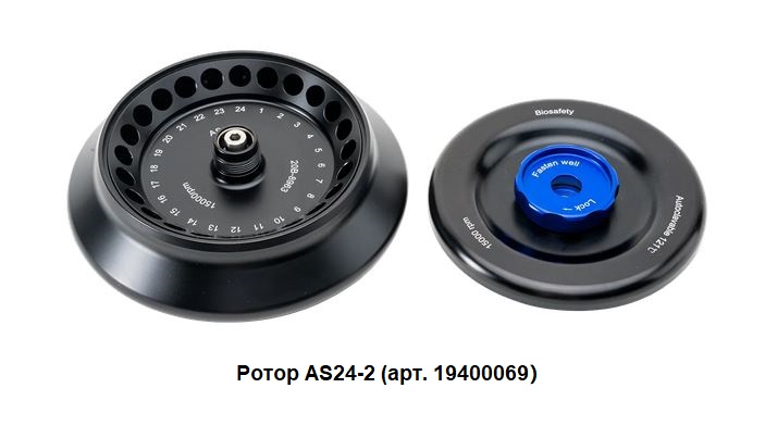 - Ротор AS24−2 из алюминиевого сплава, выдерживает до 15 000 об/мин, максимальное ускорение 21 380 × g, вместимость 24 пробирки объёмом 2 мл, 1,5 мл, 0,5 мл или 0,2 мл.