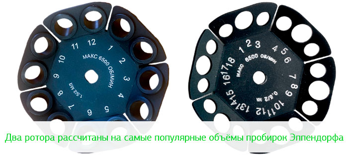 В комплект ТАГЛЕР МЦ−6000 входят два сменных ротора: 1,5М и 0,2/0,5М. Первый позволяет работать с пробирками Эппендорфа объёмом 1,5 или 2 мл. Максимальное количество пробирок: 12 шт.