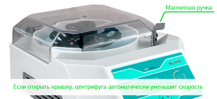 Прибор оснащён системой блокировки: при открытой крышке центрифуга работает только на низкой скорости 2 800 об/мин. При закрытой крышке доступен режим 6 000 об/мин. При открытии крышки во время работы скорость автоматически снижается до безопасного уровня.