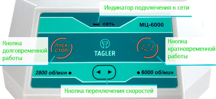 Режим долговременной работы активируется нажатием соответствующей кнопки и поддерживается до повторного нажатия. Кратковременный режим используется для центрифугирования и работы в режиме вортекса — прибор работает только при удержании кнопки.
