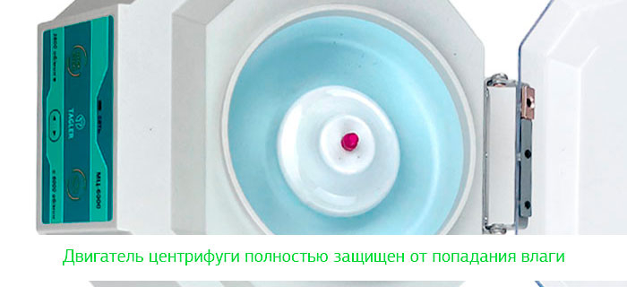 Механизм центрифуги защищён от случайного попадания жидкостей, что повышает надёжность и безопасность эксплуатации прибора.
