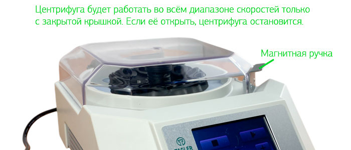 Работа на скорости выше 2 800 об/мин возможна только при закрытой крышке. При открытии крышки во время работы прибор автоматически останавливается, обеспечивая безопасность оператора.