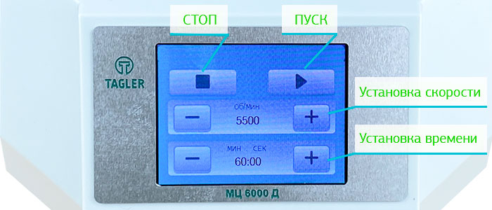 Управление осуществляется через сенсорную панель с иконками «Пуск» и «Стоп», а также настройкой скорости и времени. Диапазон регулировки скорости составляет от 300 до 6 000 об/мин, времени — от 0 до 60 мин.